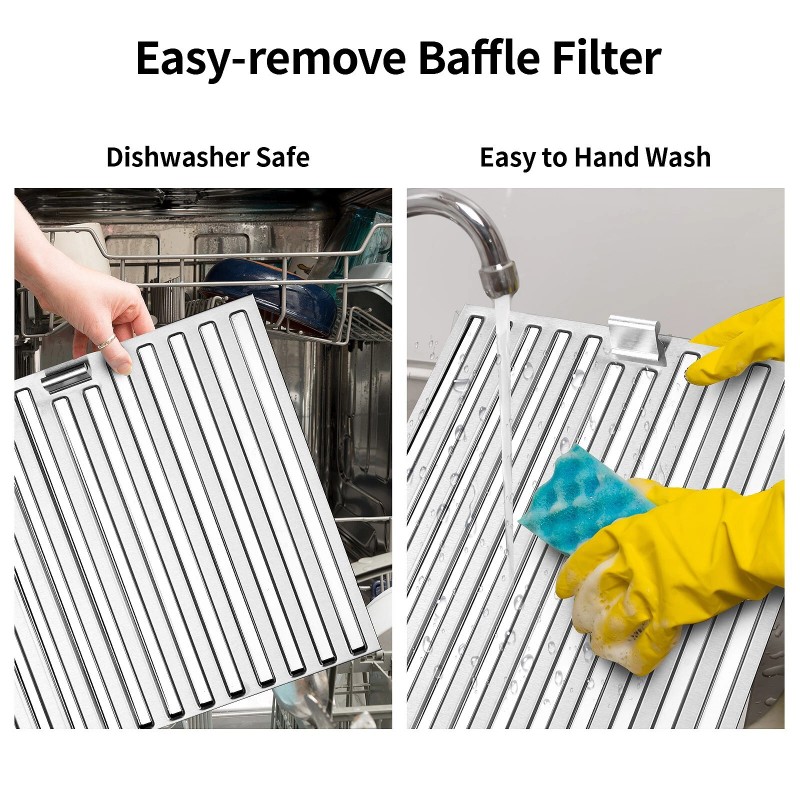 Stainless steel baffle filers are removable and dishwasher-safe, can also be hand washed, can maintain its perfect appearance even just with towel ,neutral detergent and warm water, save your cleaning time.