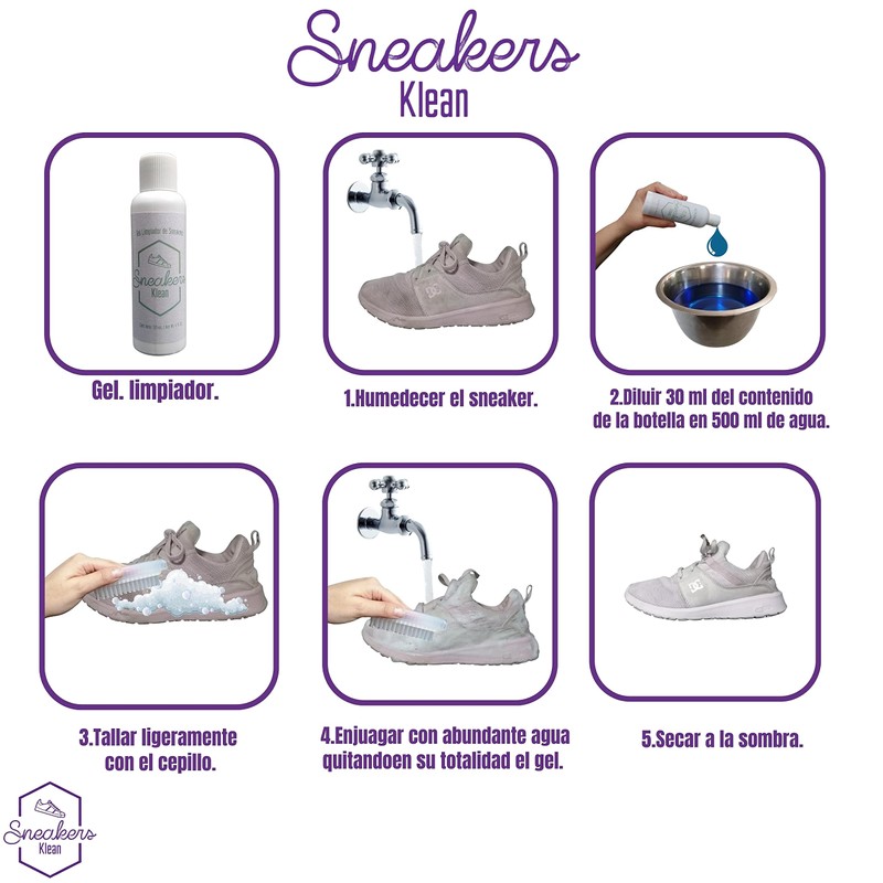 Blanquea la suela de tus Sneakers. Una botella de limpiador de zapatos resuelve varios problemas: limpieza, blanqueamiento y mantenimiento. Una botella normalmente limpiará de 5 a 6 pares. 2. Remueve la suciedad amarilla por reacción química, restaurando su verdadero color esencialmente. 3. Este limpiador puede quitar las manchas de manera rápida y fácil. 4. Se puede usar para quitar el amarillo de una variedad de Tenis o cualquier zapato deportivos de distintas marcas. Gel Limpiador de Sneakers Mantén tus sneakers impecables siempre, ten a la mano este gel limpiador para calzado deportivo sneakers klean . Este gel es ideal para que elimines las manchas y mugre rápidamente de tus tenis.
