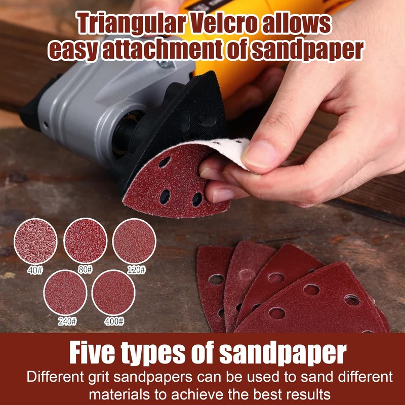 - Schleifplatte Schleifaufsatz: Komplettset mit 4 Edelstahl dreieck schleifplatte (90mm) + 25 rotem Schleifpapier Aluminiumoxid(40/80/120/240/400er Körnung). Inkl. 5 Schleifpapier pro Körnungstyp für grobes bis Feinschliff-Finish.