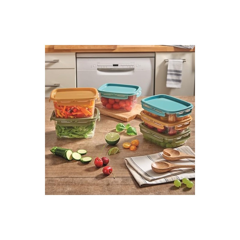 - Advantages of the set: The 4 safety latches on the lid and the gasket ensure a perfect seal. They also make it easy to move the containers around. Convenience in the kitchen is essential! The compact and flat design allows for easy stacking, whether in the fridge, freezer or on your pantry shelves. Once removed from the fridge or freezer, they can be used in the microwave for defrosting or reheating without the lid.