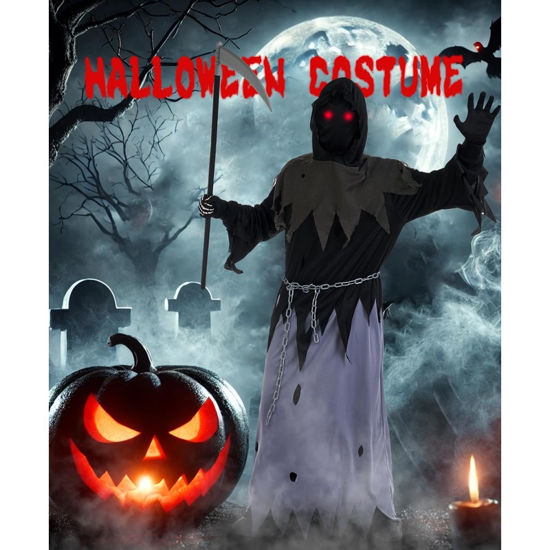 - Product Overview: Elevate your Halloween game with our stunning Grim Reaper Costume for Adults. This ensemble comes complete with glowing red eyes for an eerie effect, a detachable scythe to add to the terror, plus gloves, glasses, and chains to complete the chilling look. Perfect for any Halloween party or haunted house event.