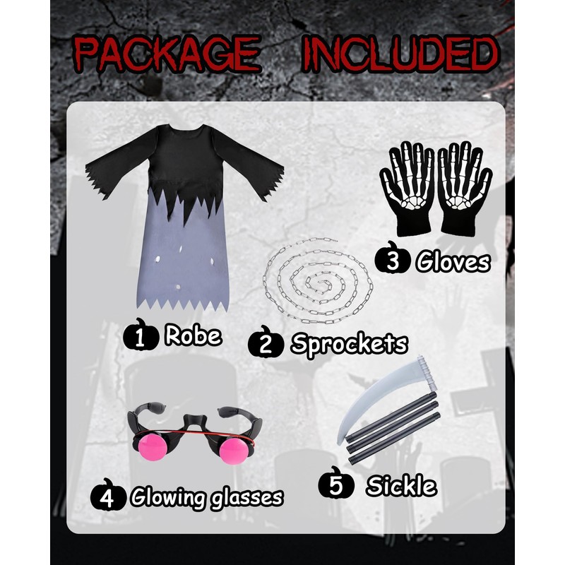 - Full Set: No need to search for separate accessories; our Grim Reaper Costume comes with everything you need to complete your look. From the menacing glowing eyes to the iconic scythe, gloves, glasses, and chains, you'll be ready to strike fear into the hearts of all who behold you. Order now and get ready to become the life of the Halloween party!