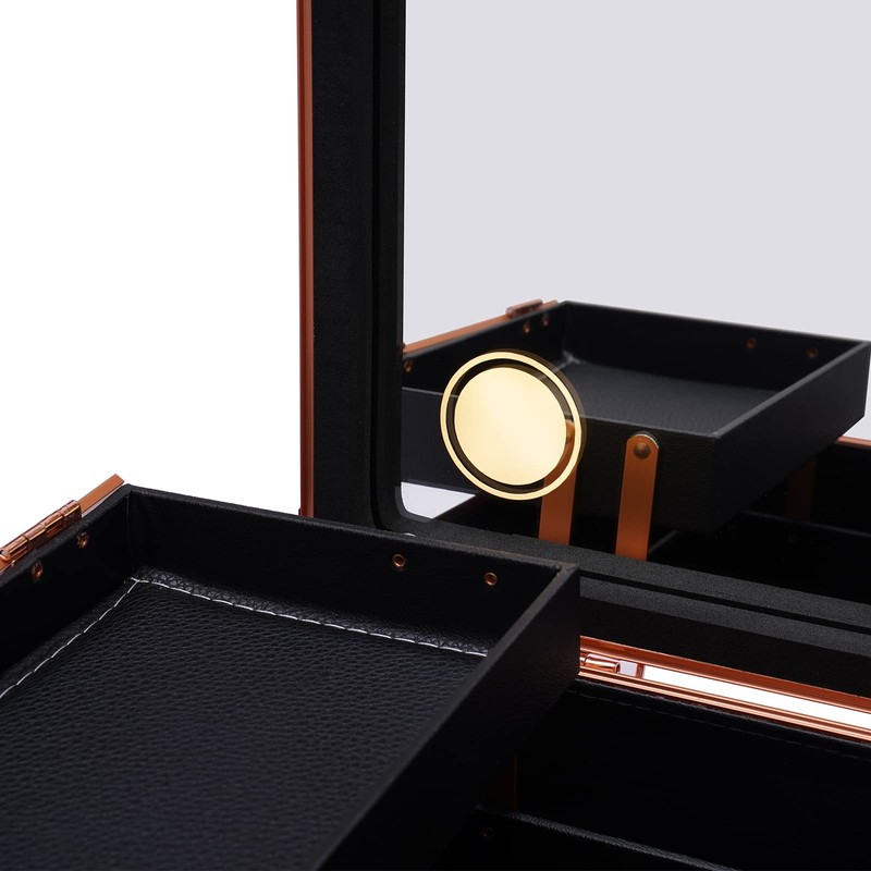Whether traveling or on business, we all want to show our most sophisticated appearance. But we are always annoyed because the cosmetics are too fragmented and not well stored. Therefore, we have customized this makeup train case for you. It comes with 4 dimmable LED lights and a mirror, making it a self-contained portable vanity. Many features such as compartmentalized storage and sophisticated appearance make it stand out.