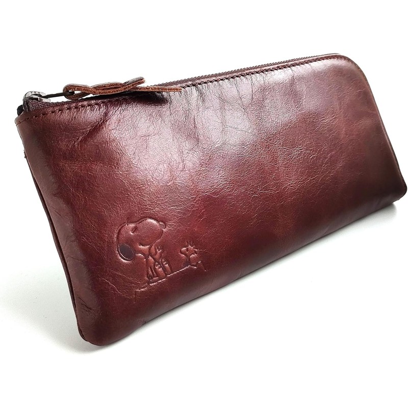 Snoopy Adult Long Wallet, Genuine Leather, Slim Design, with Exterior Pocket and L-Shaped Zipper [90941] (Brown)