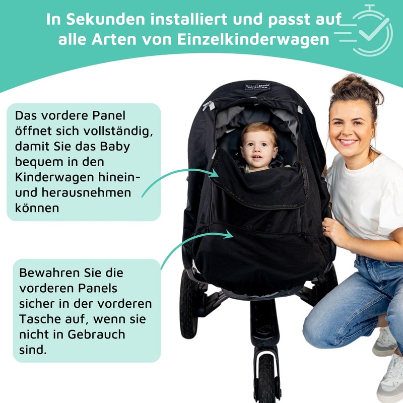 - Super safe sun protection from mum – SnoozeShade pushchair sun protection and blackout cover for babies and toddlers blocks up to 99% of harmful UV rays. It serves as a shield from sun, wind, light rain and insects to ensure your child's sensitive eyes and skin are protected during sunny walks (so much more effective than a stroller umbrella) and that your child stays comfortable while watching the world from their stroller.