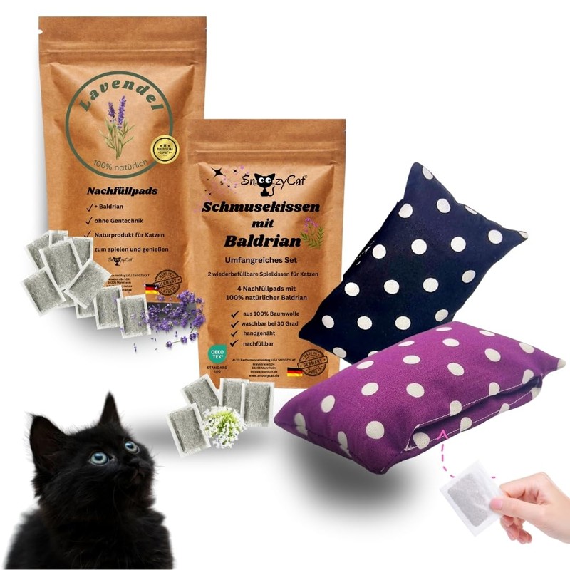 SNOOZYCAT Pack of 2 Refillable Valerian Catnip Cushions + 4 Refill Bags, Handmade and Washable, 100% Cotton Natural Raw Materials (Set Lavender)