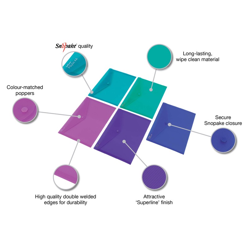 The ‘Elec tra’ assorted colour pack of Snopake 12844 Polyfile in ‘A4’ size measures approx. 330 x 225mm and is made from strong 200 micron polypropylene, with a ‘Superline’ emboss finish, and completed with a strong press-stud to secure all contents.