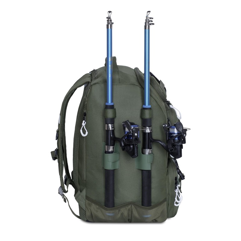 SNORKA Fishing Backpack Waterproof with Tackle Boxes and Rod Holders; Plus Rain Cover, Padded Back Support, Insulated Front Pocket for Hot/Cold Lunch, Water Bottle Holder (Army Green)