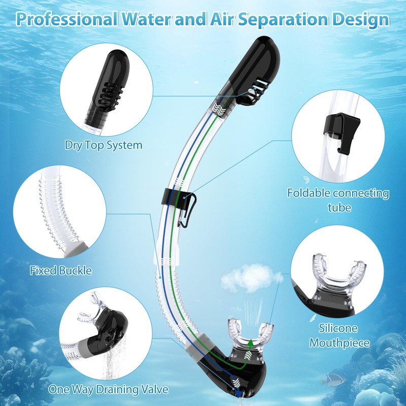 - 【Scientific and Safe Dry Top Snorkel】The stable dry float valve design ensures smooth and free breathing underwater. When underwater, the top valve will seal the snorkel to prevent water from entering, and the bottom valve can quickly drain water. It works well even when the waves hit you from above, perfect for professionals, beginners don't have to worry