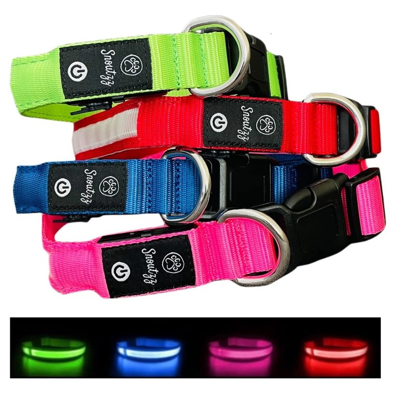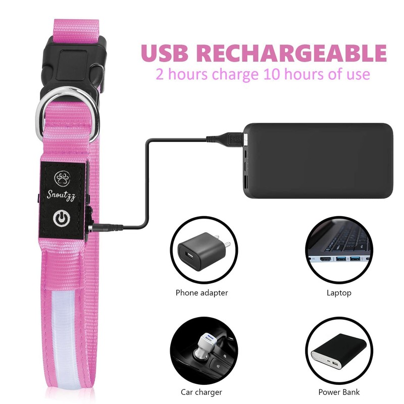 SNOUTZZ® LED Flashing Dog Collar USB Rechargeable - Ultra Bright & Highly Visible - Waterproof & Increased Safety - Available 4 Colours & 4 Sizes (Pink, Medium)