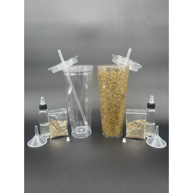 - ★24 oz clear acrylic double wall insulated snow globe tumbler kit: This kit includes everything you need to make a beautiful snowglobe tumbler. It includes a clear acrylic tumbler, a snow globe liquid, glitter, a funnel, a straw, a lid, 10 oz of glitter, a funnel, 1 oz of magic snowglobe liquid, and a 2 oz squeeze bottle container.