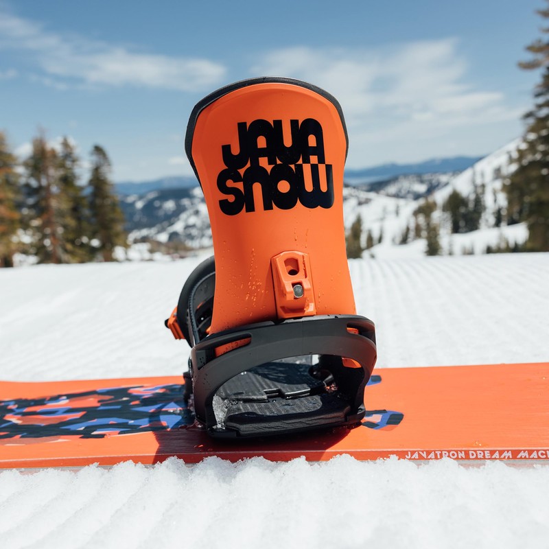 Javatron Dream Machines / Java Snowboards / Fuzz Pedal Snowboard Binding in Hazard Orange. Lightweight and super durable snowboard binding that is easy to get in and out of. Has easy to adjust forward lean, adjustable toe and ankle straps with easy to grab ratchet closures. Padded Hi back for comfort and padded under foot helps absorb vibration for a smoother ride. Ankle strap can tuck into receiving end for cleaner look on top of foot. 4 x 4 disc plate for adjusting stance angles. Includes mounting hardware. Available in 2 sizes, based on boot size - Medium (US unisex size 7-10) , Large (US unisex size 9-14)