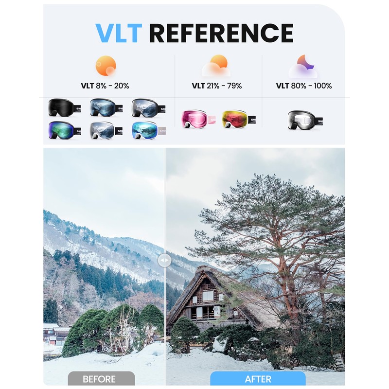 - Spherical Lenses: Experience superior vision on the slopes with our ski goggles featuring a spherical lens design. Enjoy a wider field of view and enhanced depth perception, ensuring clear, undistorted vision in any skiing conditions