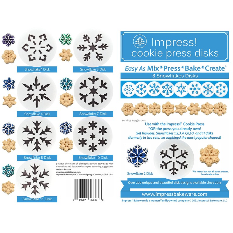- 8 COOKIE PRESS DISKS IN 8 FUN DESIGNS: Snowflake 1, Snowflake 2, Snowflake 3, Snowflake 4, Snowflake 7, Snowflake 8, Snowflake 10 and Snowflake 11.