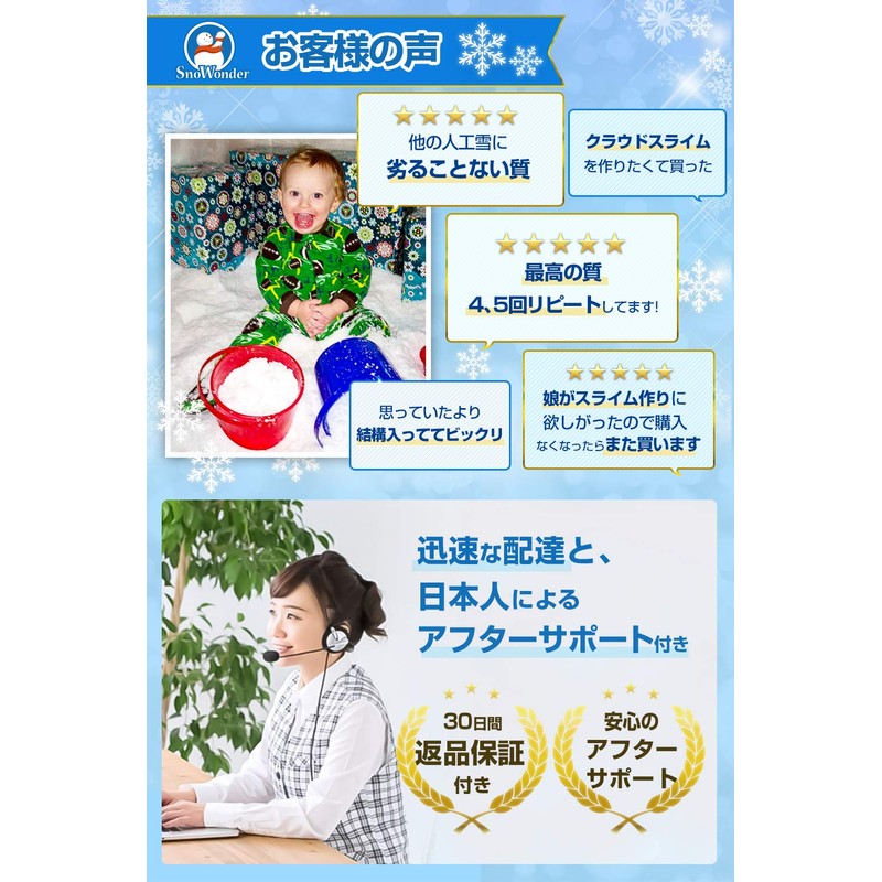 • Note: 1. When playing outdoors, play with blue sheet or children's pool will make it easy to clean up. 2. If you want to create cold snow, please cool it down for 45 minutes or make snow with ice water. 3. Do not flush it to the sink when disposing snow. This may cause clogging. Allow to dry and dispose or mix in soil after drying, and it will blend naturally. Salt in the snow will break down.