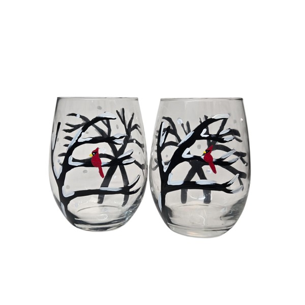 - Set of 2 Snowy Red Cardinal Stemless wine glasses; more stable than a traditional wine glass