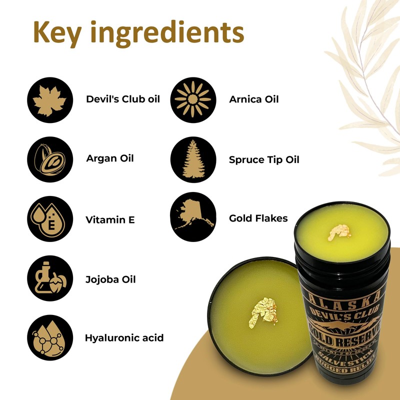 - Enriched with Alaska Devil's Club Oil: Infused with the power of the Alaskan wilderness, our herbal salve stick uses Devil's Club Oil for its renowned soothing properties, providing rugged relief to adventurers and hard-working individuals alike.