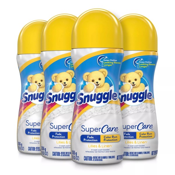 - You get four 9 ounce bottles of Snuggle SuperCare In-wash Scent Booster beads in Lilies and Linen scent