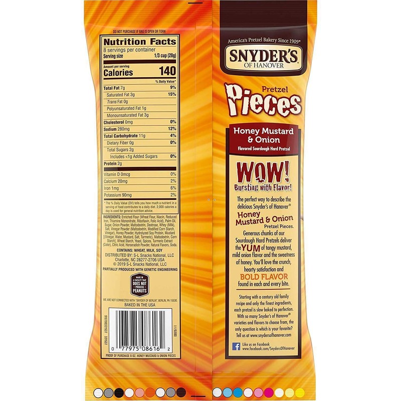 Snyder's of Hanover Pretzel Pieces are Sourdough Hard Pretzels baked to perfection then broken into generous chunks, and coated with Honey Mustard & Onion Seasoning. They are bursting with intense flavor and delicious crunch for the perfect snack. And they're a baked alternative to potato chips with 0g trans fat, no MSG, and made in a facility that does not process peanuts. You'll love these crunchy pretzel pieces as a lunch, snack or school snack. Snyder's of Hanover has been America's Pretzel Bakery since 1909 and our pretzels give you that delicious crunch for the perfect snack! Non-GMO project verified and made in a facility that does not process peanuts, Snyder's of Hanover pretzels are made from wholesome ingredients, kneaded, and oven-baked to seal in all the flavor. Snyder's of Hanover pretzels have been shared across tables, across generations and across the country, making us America's favorite pretzel brand.