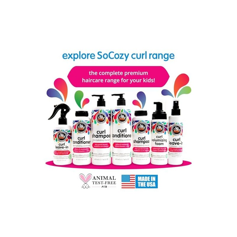 So Cozy Leave In Conditioner Spray, Paraben-Free Detangler for Kids' Curly Hair, Deep Conditioner & Tangle-Free Curls, Gentle & Nourishing with Keratin, Vitamin B5, Olive Oil & Jojoba OilSo Cozy Curl Leave In Conditioner Spray is enriched with Keratin, Vitamin B5, Plum Seed Oil, Jojoba Oil, and Olive oil, our leave in conditioner spray for curly hair moisturizes and nourishes curls to condition, cleanse and restore their natural balance. Its lightweight formula helps repair, strengthen & protect your child's curls without weighing them down, leaving them vibrant, healthy-looking and full of life.More than just a kids leave in conditioner, our conditioning spray is also a hair detangler spray for kids that can make daily haircare routines a breeze. With just a couple of sprays, our detangling spray evenly coats damp or dry hair to effortlessly detangle knots in 1 easy step.We've formulated our spray leave in conditioner to be kid-friendly and free from nasty ingredients, so you can be secure that our curly hair detangler doesn't contain any parabens, sulfates, phthalates, & synthetics dyes and colors that could irritate delicate scalps and hair. Make every day a good hair day for your little one with SoCozy!