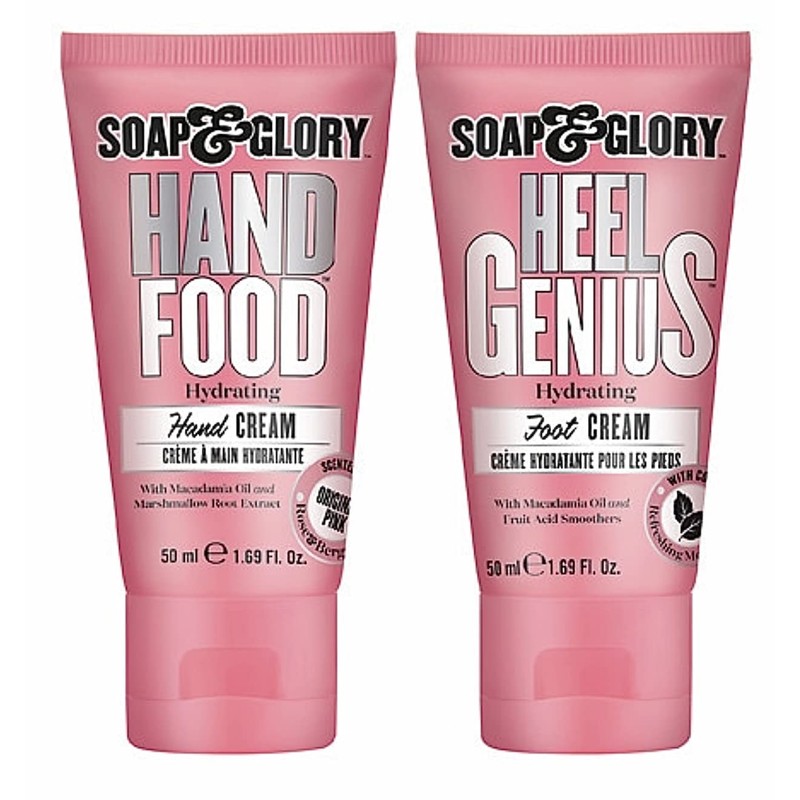 In this set of 2 includes Soap & Glory's award-winning hand cream & foot cream. Both are formulated to hydrate, moisturize and nourish very dry skin. The foot cream is formulated with allantoin, macadamia oil, menthol, bilberry, orange and lemon fruit acid smoothers. The hand cream is formulated with with shea butter, macadamia oil, grape seed oil and almond oil. Dermatologically tested.