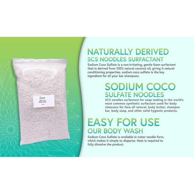 - ✅ Naturally derived scs noodles surfactant: Sodium Coco Sulfate is a non-irritating, gentle foam surfactant that is derived from 100% natural coconut oil, giving it natural conditioning properties. sodium coco sulfate is the key ingredient for all your bar shampoos.