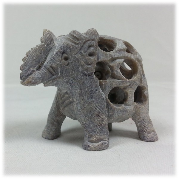 This beautifully stylised elephant statuette has been hand carved in India from Soapstone. Inside the main body of the elephant is a smaller elephant statuette, visible through the cut-out holes.