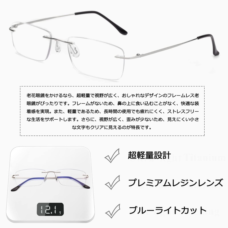 - 軽量フレームレスデザイン►リムレスメガネは、フレームがないため、非常に軽量で快適です。フレームがないため、長時間の着用でも耳や鼻への負担が少なく、ストレスフリーで使用できます。また,フレームがないため、スタイリッシュでモダンな外観を持っています。また、フレームがないため、顔の輪郭に合わせて調整できるため、フレーム付きのメガネよりも適合性が高く、より良い見た目を実現できます。そして、視野がより広く、より自然な視界を提供することができます。