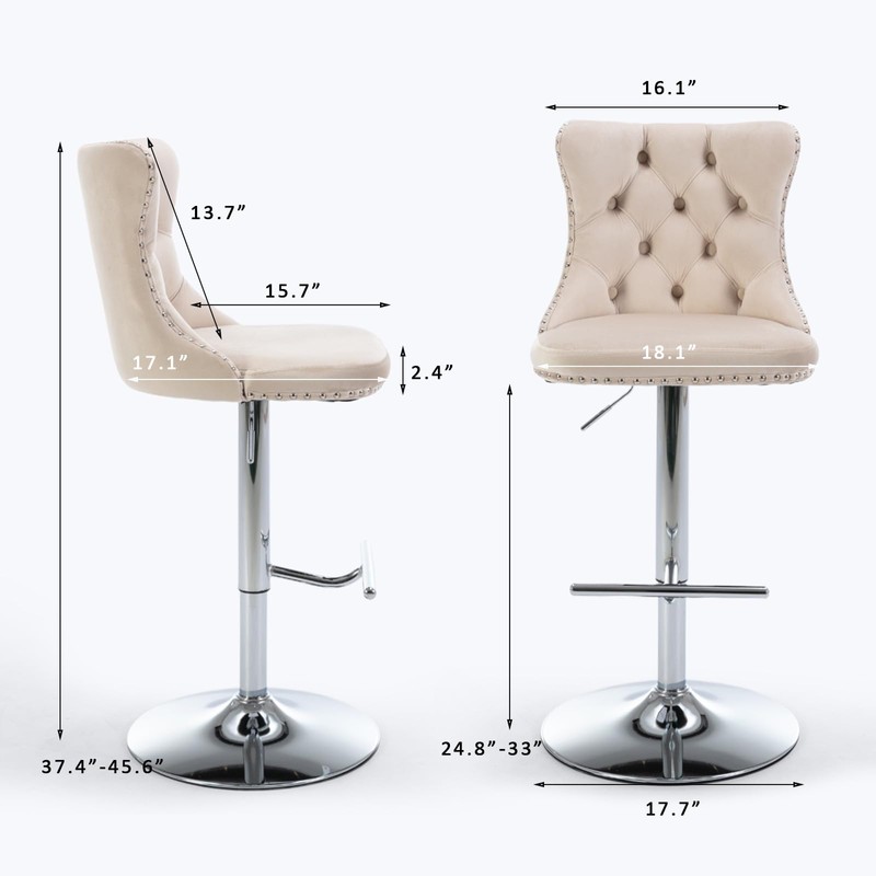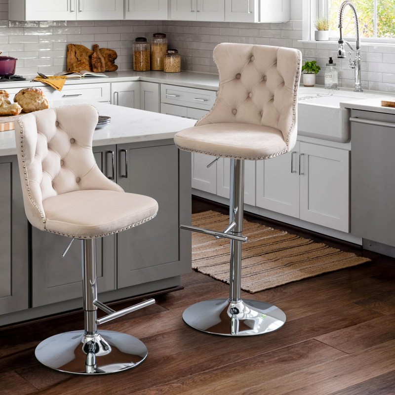 SoarFlash Velvet Bar Stool Set of 2, Adjustable Swivel Bar Stools with Silver Plated Metal Leg, Button Tufted, Footrest, Chrome Nailhead, Counter Height Chair for Kitchen, Bar, Dining Room (Beige)