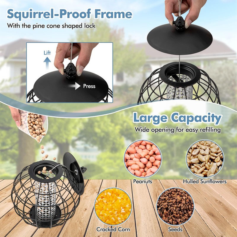 - *Effective Protection Design* The feeder features a cylindrical hollow body surrounded by a metal grid. This allows birds to have access from all sides, while larger animals need to stay outside.