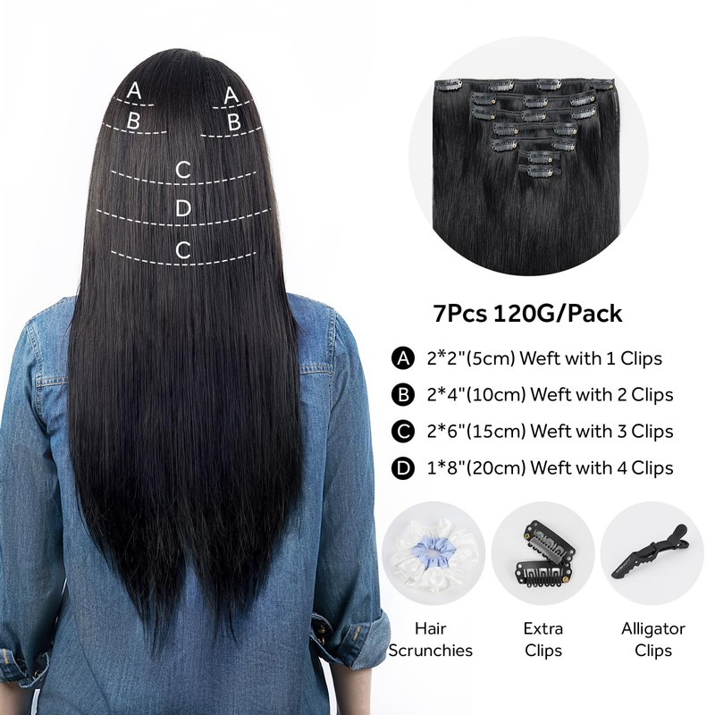 - Specifications of Hair Extensions: 7pcs Hair Weft (Widths: 20cm*1, 15cm*2, 10cm*2, 5cm*2) with 14 clips in 120g, 5 kinds of lengths, you can choose according to your needs. Just one set is enough to complete the full head, while 2-3 sets can be worn for a fuller look