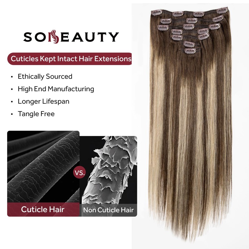 - High Quality Real Human Hair Extensions: SOBEAUTY clip in hair extensions use 100% remy human hair, which is soft and natural, compared with synthetic hair, it fits perfectly with your own hair. Easy to use, you can experience salon-like effects even at home