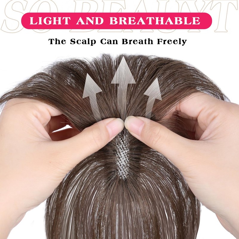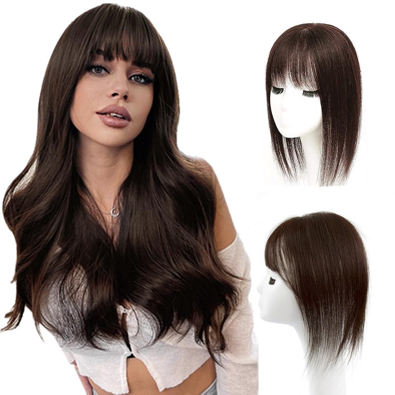 - WHY USE HAIR TOPPERS:Human Hair Topper with Bangs cover your scalp to disguise bald or thinning hair, add volume, and create healthy looking hair. Similar to a small wig, designed to blend naturally with your hair and scalp line