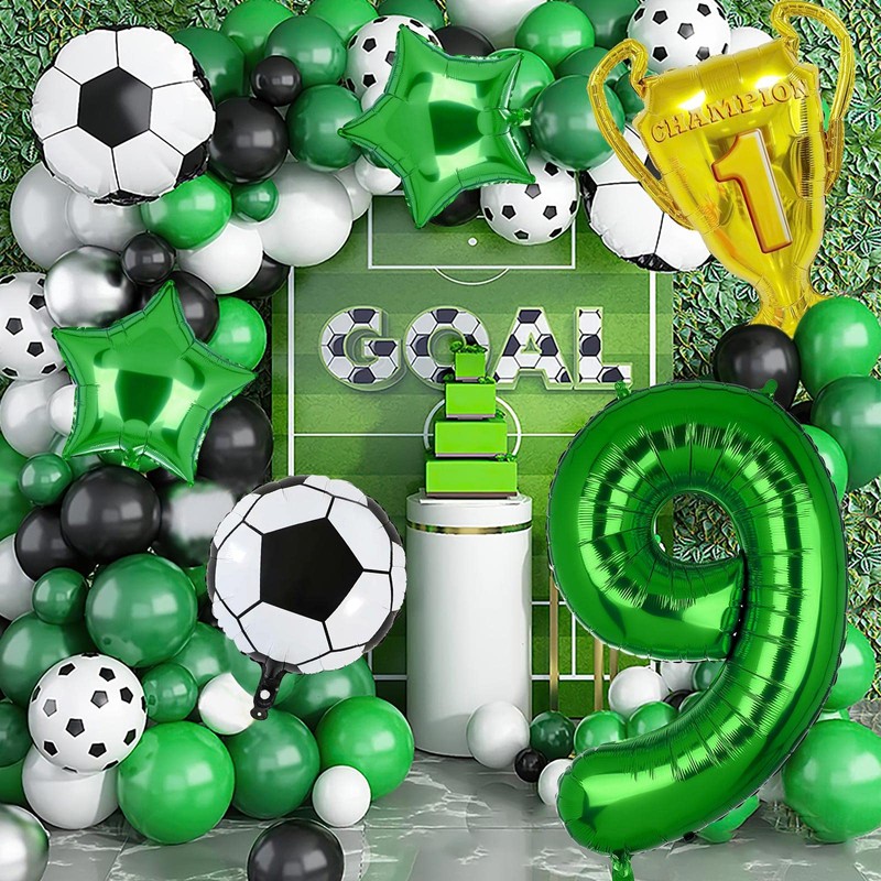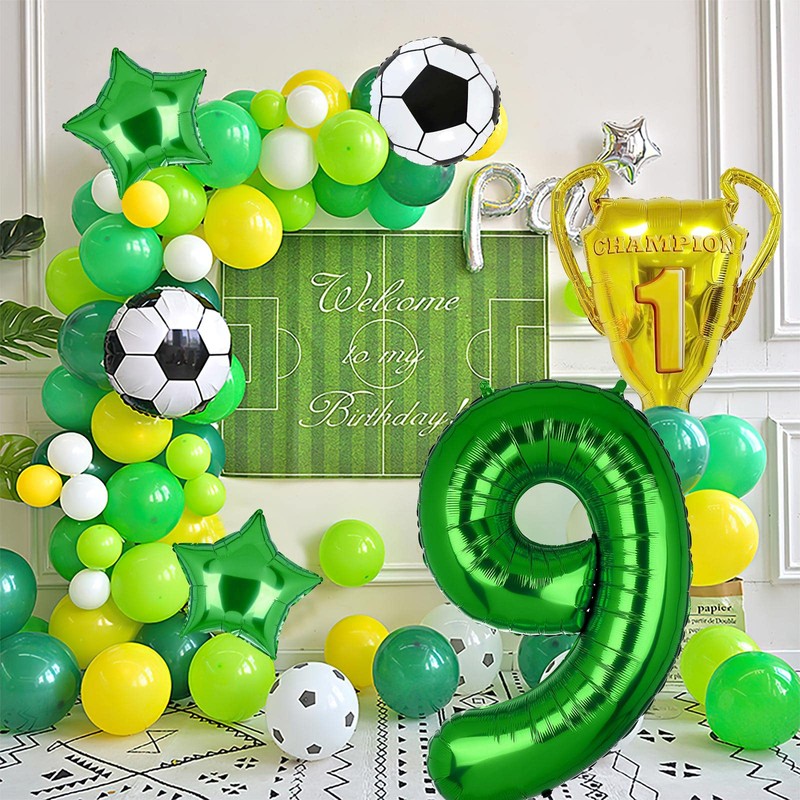 - Package: 1pc 40 inch green number balloon,1pc golden champions trophy balloon,2pcs green soccer foil balloons, 2pcs star green foil balloons.