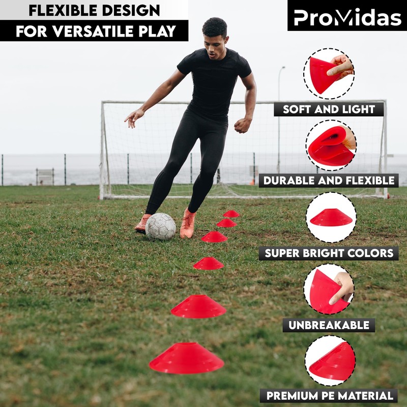 - ⚽Flexible Strength for Soccer Excellence: ProMidas Disc cones are built tough with high-quality PP material and weigh 22g, ensuring they withstand rough play and extreme weather without cracking or breaking, providing long-lasting performance