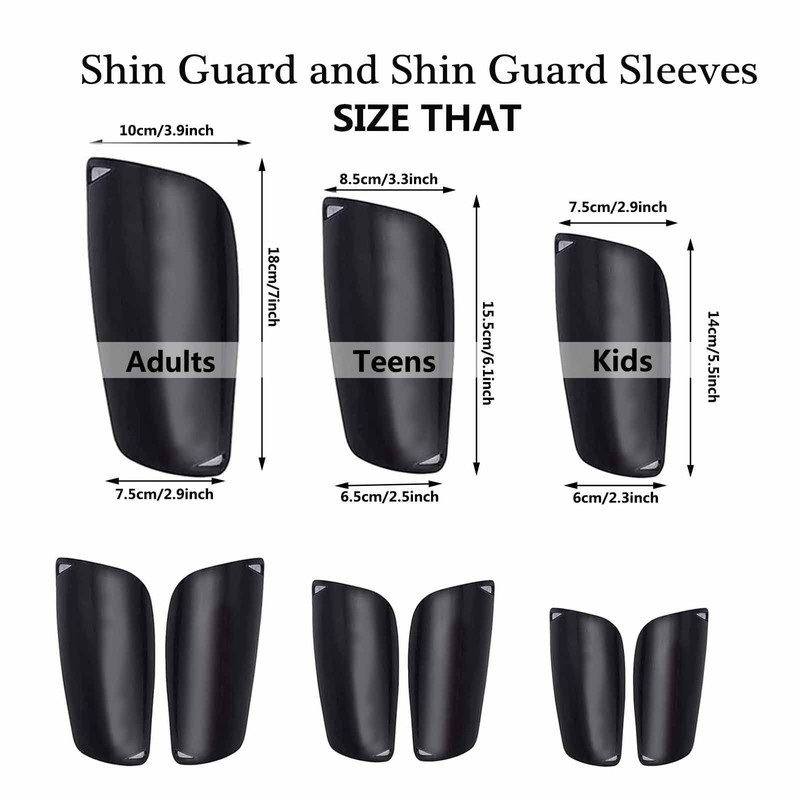 - Soccer Shin sleeves Three Sizes - You will get 1 pairs of soccer shin guards and 1 pairs of shin guard sleeves. Our soccer shin sleeves have three sizes, which are intended for Kids, teens and adults. Kids size: 4.3"Top X3.5"Bottom X6.7"High,Teens size: 4.3"Top X3.7"Bottom X7.4"High, Adults size: 5.3"Top X4.5"Bottom X9.4"High . Perfect for the beginner or elite athlete who loves playing soccer. This Shin Guard Compression sleeve provides targeted support where it is needed the most.