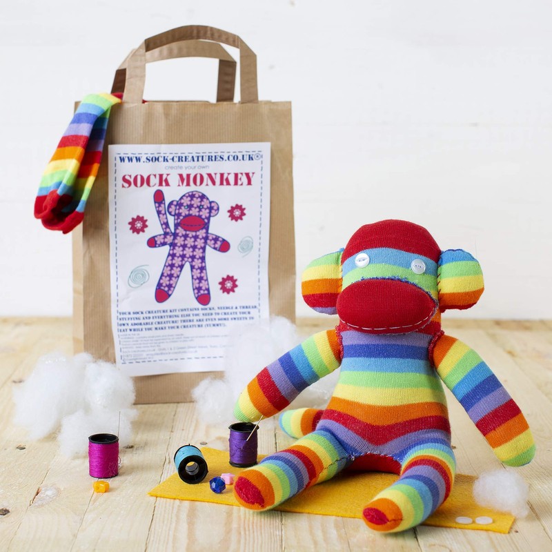 Sew your own monkey with this sock monkey craft kit. This craft kit contains everything you need to make a monkey from a pair of stripy socks. Kit includes: Socks, stuffing, needle and thread, decoration kit, instructions, template, birth certificate and even some sweeties to eat whilst making your crafty creature. This is the perfect present for girls, boys, children and adults alike. Children under 12 may require adult supervision, making it the perfect activity for younger kids with an interest in sewing to do with an adult. This monkey sewing kit comes in funky packaging, with everything contained within a sock creatures signature brown bag. Due to the handmade nature of the product, contents may vary from photographs. The kit includes materials to decorate your sock monkey toy to make it completely individual. Kit Dimensions: 28 x 20 x 10 centimetres