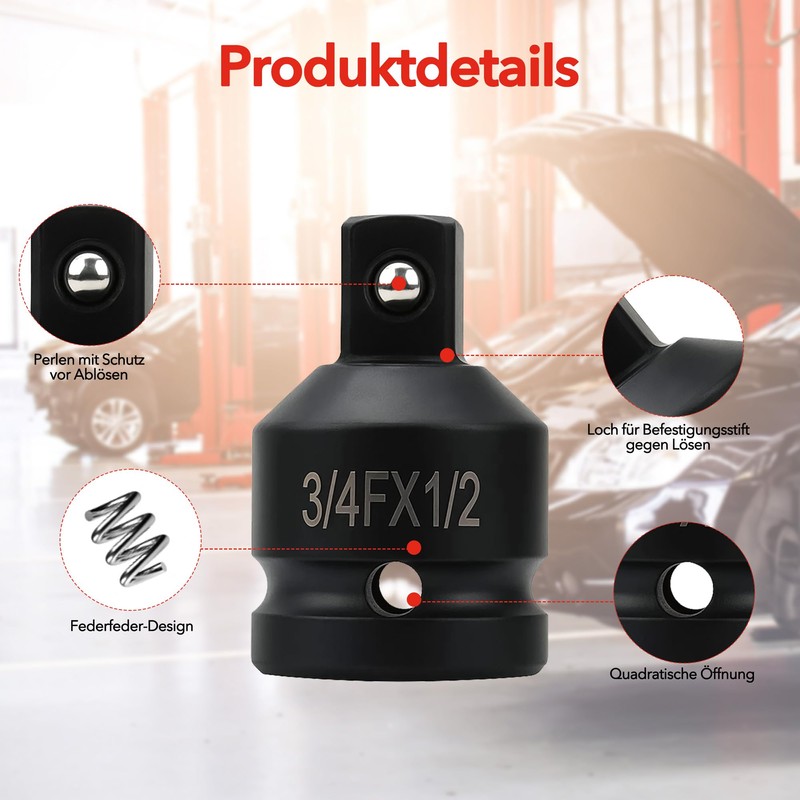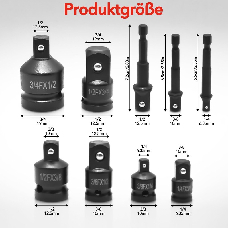 - Material: These socket adapters are made of durable, heat-treated chrome vanadium steel and are finished with a black oxide layer and an additional nickel or chrome coating. This processing reliably prevents rust formation and ensures a long service life - perfectly suited for use in industry, trade and construction.