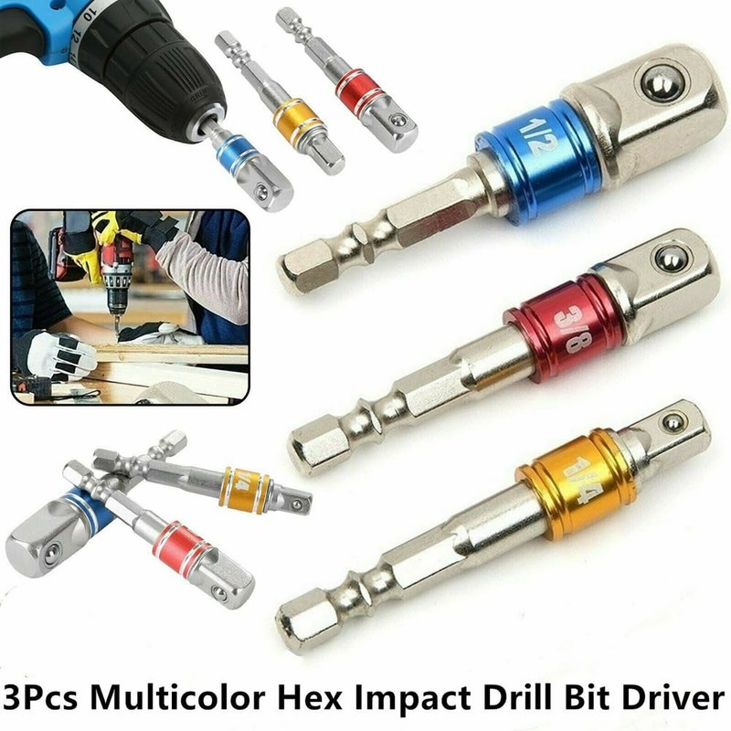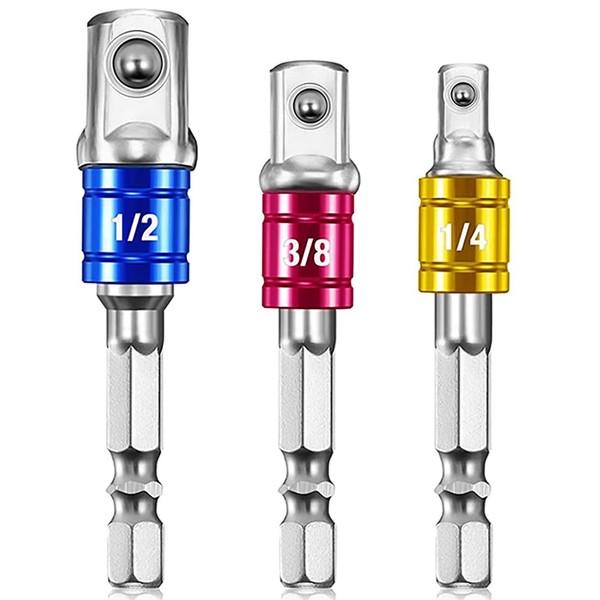 - 3Pcs - 1/4" drive adapter, 3/8" drive adapter, and 1/2" drive adapter, and each with a 1/4 inch hex shank driver socket wrench adapter set.
