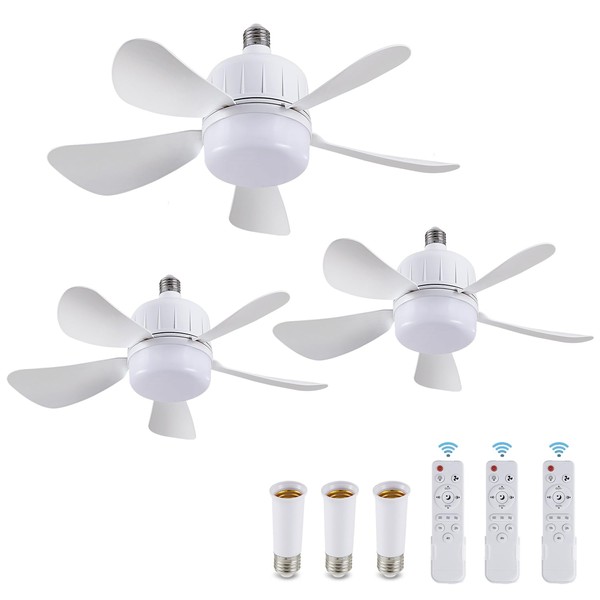 Socket Fan Light with Remote, Dimmable LED Ceiling Fans with Lights, 15" Screw in Socekt Fans and Socket Extender, 3 Colors 3000K-6500K, Replacement Light Bulb Fan for Kitchen Garage Bedroom, White-3P