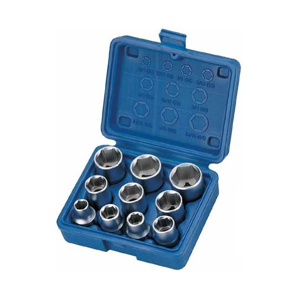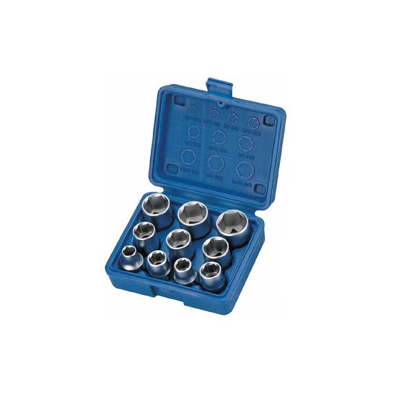 10 x inserts in hexagonal profile: 3/8, 7/16, 1/2, 9/16, 5/8, 11/16, 3/4, 13/16, 7/8, 15/16 inches.