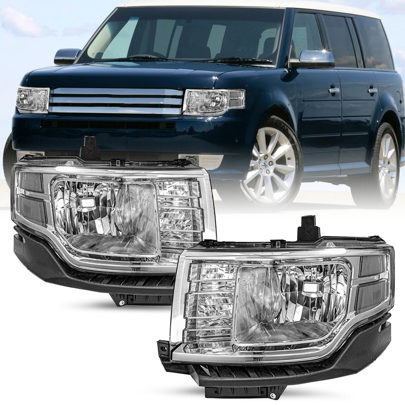 SOCKIR Headlight fit for 2009-2012 Ford Flex OE Style Halogen Headlamp Replacement Right Passenger& Left Driver Side(Chrome Housing with Clear Reflector)