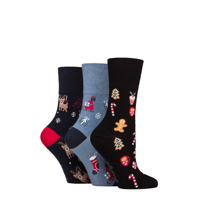 SockShop Gentle Grip Women's Cotton Christmas Socks Pack of 3, Navy blue / black