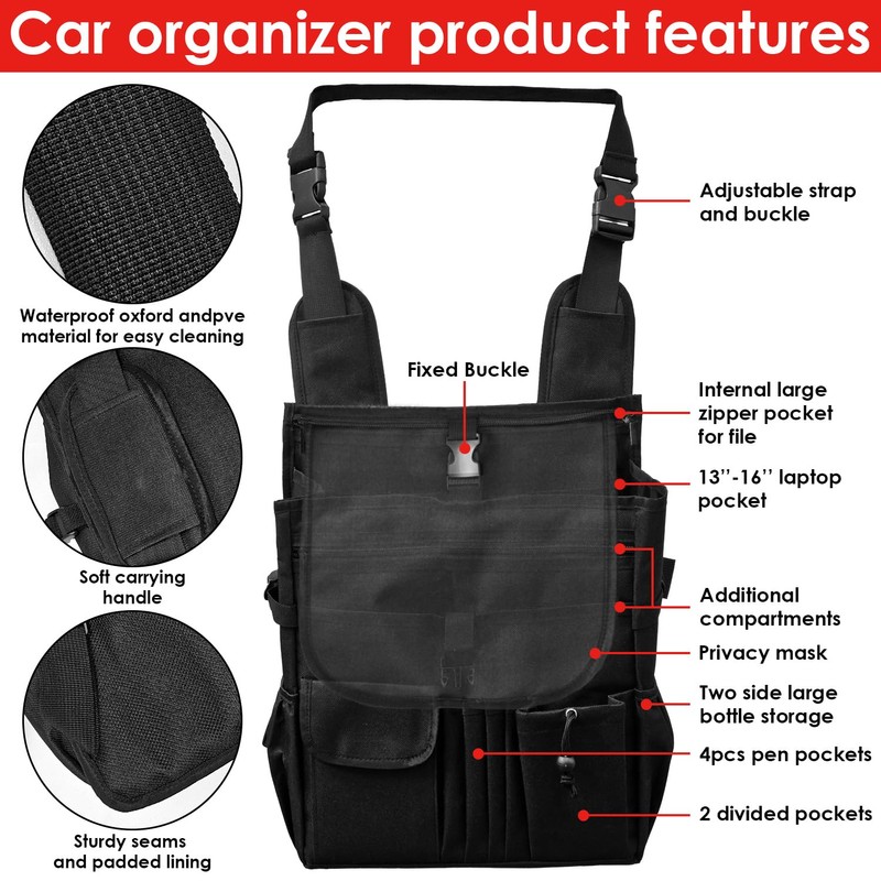 - 【Ample Storage Capacity】Car front seat organizer features 13 spacious pockets to organize water bottles, phones, pens, files, and laptops up to 16 inches, keeping essentials within reach for professionals and drivers.