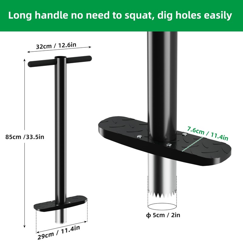 • Soil storage function: When you are done cutting the lawn, you don’t have to worry about spending extra time picking up the soil. The bulb planting tool has a storage function in the middle, you can turn the tool upside down and easily pour out the grass plug.