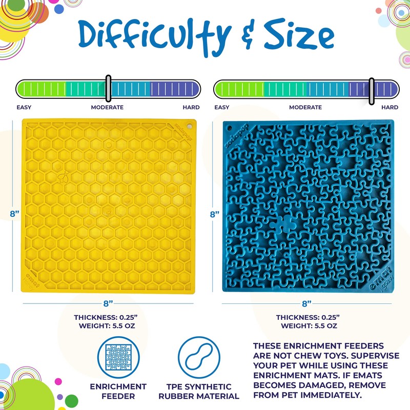 - FUN ENRICHMENT FEEDERS – This durable rubber eMat bundle pairs one of our most difficult (Jigsaw eMat) with one of our intermediate (Honeycomb eMat) level licking designs. Spread soft treats on them for a tasty licking challenge. Large 8" x 8”.