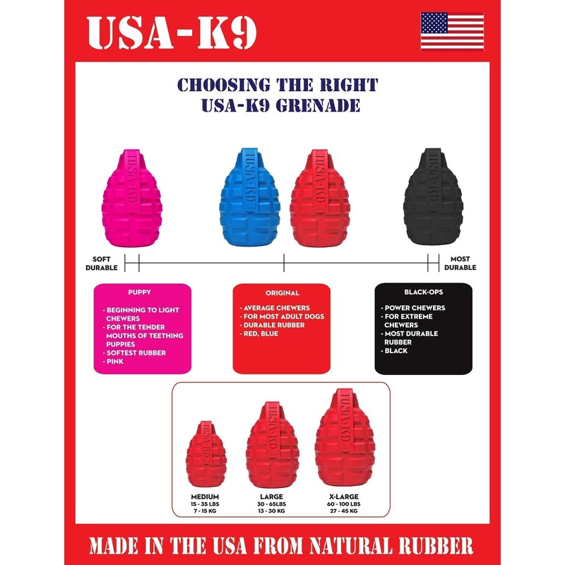 USA-K9 rubber grenade crazy bounce, fetch and chew toy is proudly made in the USA from our proprietary natural rubber compound that is FDA compliant, non- toxic, biodegradable and veterinarian approved. Use this fun rubber chew toy as a treat dispenser, or slow feeder for your pup! Fill with their favorite treats or food and top off with peanut butter to create an engaging and stimulating puzzle for mealtime, snack time, or crate training time to create a positive experience. This grenade shaped dog toy is made from our Original natural rubber compound, which is very durable while remaining delightfully chewy. Ideal for average chewers and teething puppies. Remember that no dog chew toy is indestructible. Playtime should be supervised as much as possible, and dog toys should be inspected and replaced when heavy wear and tear is visible. USA-K9 toys are dishwasher safe and super easy to keep clean! All USA-K9 products are made in the USA, meaning they comply with USA environmental standards which are among the highest in the world! Our dog toys contain natural rubber that comes from trees, which is a renewable resource. We use only FDA Compliant ingredients that are safe for your dog and the environment. We keep jobs in America by providing local jobs, paying fair wages and providing assistance with health care. We comply with OSHA standards, providing a safe and healthy working environment. USA-K9 is dedicated to developing socially and environmentally responsible business practices. USA-K9 Proudly donates products to working dog and service animal organizations through its "for American Working Dogs" (4-AWD) Program.