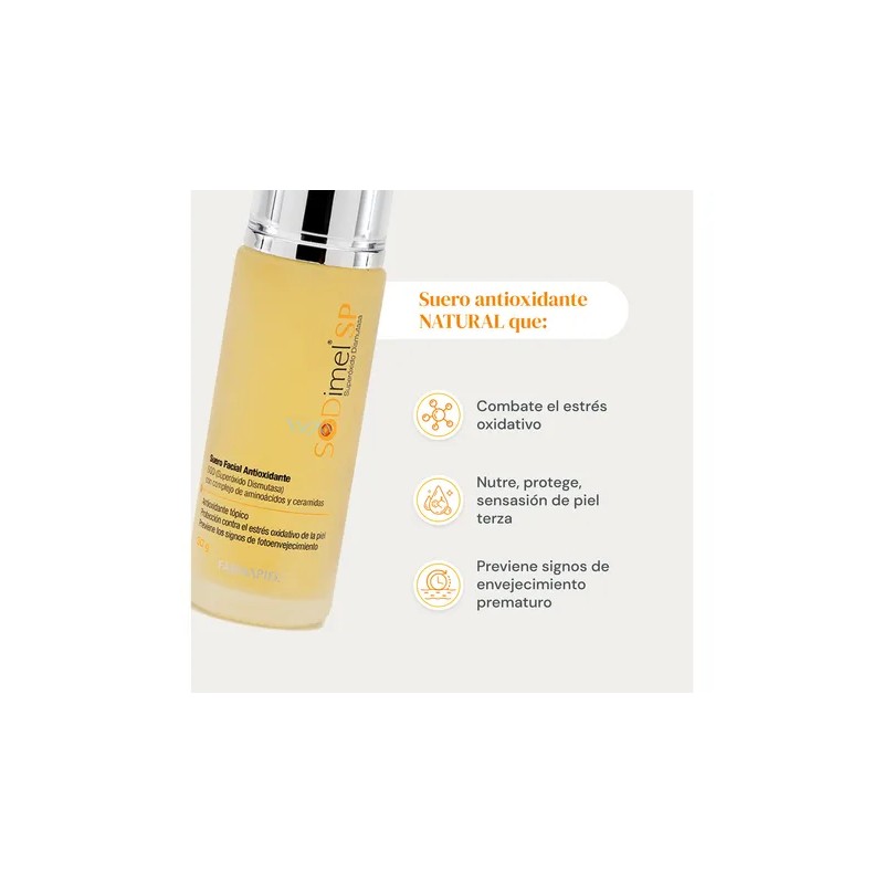 - Sodimel suero es un suero facial antioxidante con una fórmula innovadora, diseñado como auxiliar para atenuar el estrés oxidativo y actuar contra el envejecimiento celular cutáneo provocado por factores ambientales como la contaminación y la exposición a rayos UV.