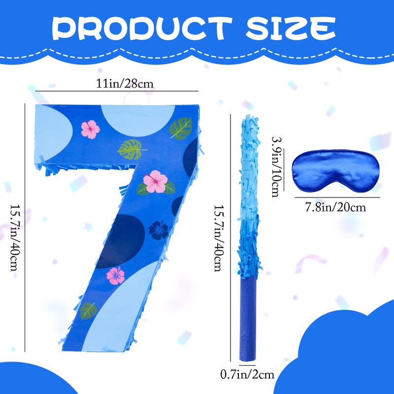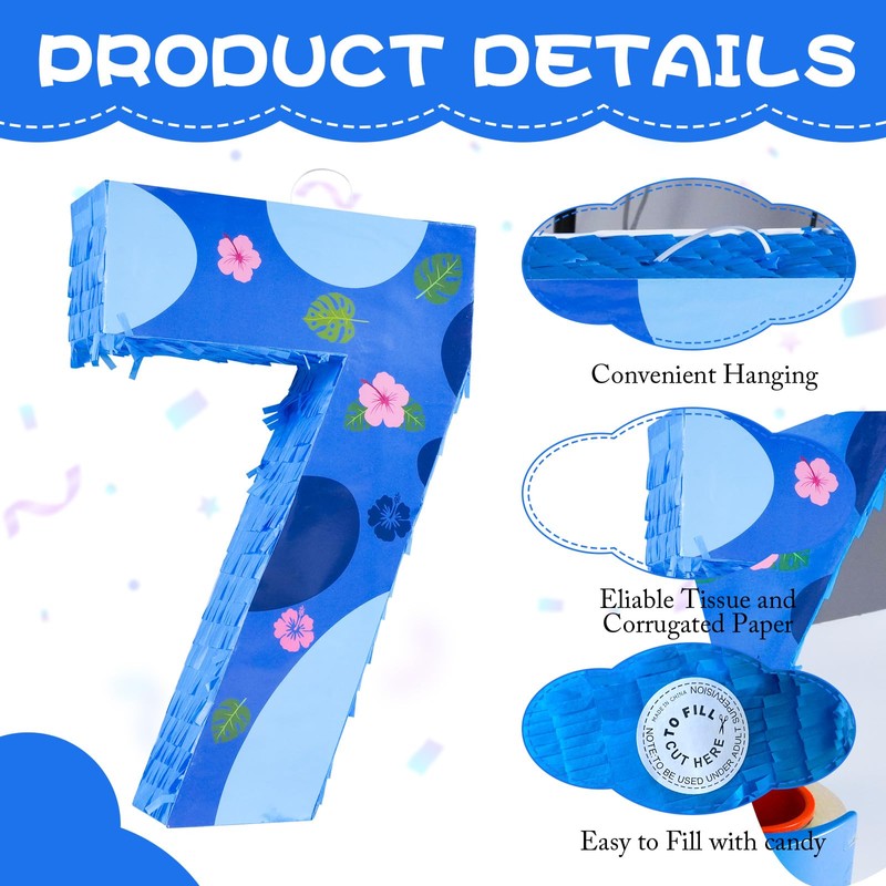 Package Contain: This set includes a hawaii pattern number 7 Pinata, 30g confetti,a stick, a blindfold,with a ring at the top for easy hanging.It is very suitable for creating a cheerful party atmosphere for birthday party.Great Quality: Our Pinata is independently designed and produced by our own designers, with dedicated personnel in charge of design and production.This party pinata have a vibrant, colorful print. The product is sturdy and durable.It can easily fit 1-2 pounds of candy, providing your child with a very enjoyable outdoor gaming experience.For all occasions: The hawaii pattern number Pi?ata is suit for birthday party supplies, shower, wedding, christmas themed party and any party decorations.Adding fun, cuteness and joy atmosphere to the party.Easy to Use: You can place them on trees, walls, windows, doorways, and anywhere you like.The birthday pinata measures 15.7" x11.5" x3" with a pre-made hole and a sturdy hanging loop at the top for easy hanging wherever. Just cut an opening at the top to fill with assorted candy, chocolates, confetti, and favors for kids.Then all you need to do is have your child put on an eye mask and hit the pi?ata hanging on the tree or railing, and a lot of beautiful paper scraps and candies will appear.Service: If you have any issues, worries or concerns you are backed by our 100% Customer Satisfaction.