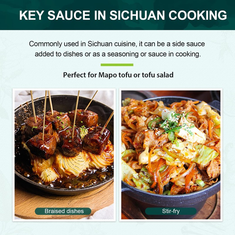 • Versatile Ingredient: Commonly used in dishes like Mapo Tofu, Twice-Cooked Pork, and Sichuan-style stir-fries, as well as in hot pots, marinades, and dipping sauces.